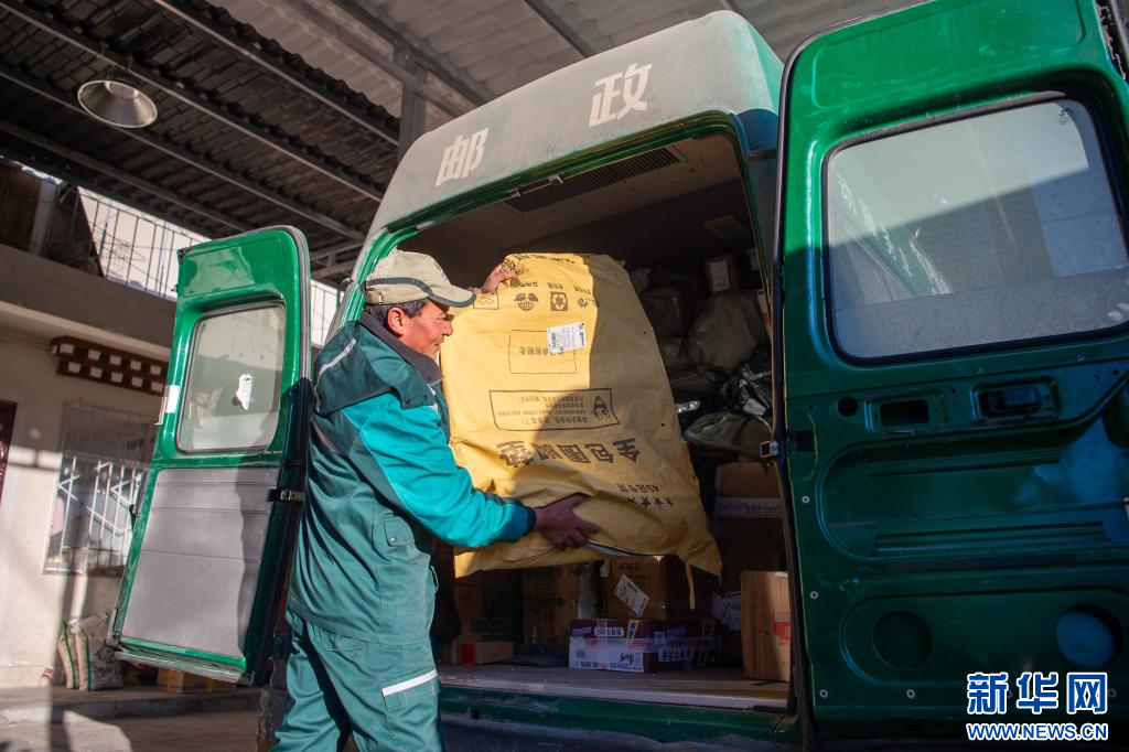 1月19日,在林芝鎮(zhèn)郵政所,郵遞員索朗次仁把準(zhǔn)備派送的快遞裝車。新華網(wǎng) 旦增努布 攝