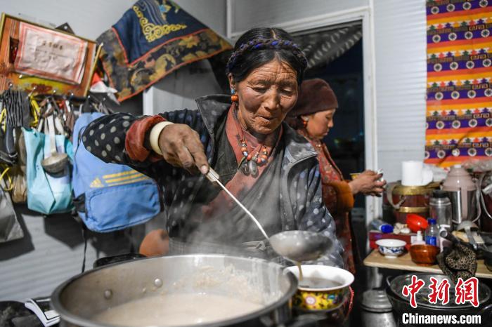 1月28日晚,西藏定日縣曲洛鄉(xiāng)措昂村安置板房內(nèi),當?shù)剞r(nóng)牧民迎來日喀則農(nóng)事新年“古突夜”,這是措昂村村民曲珍在盛“古突”?!∝暩聛硭?攝