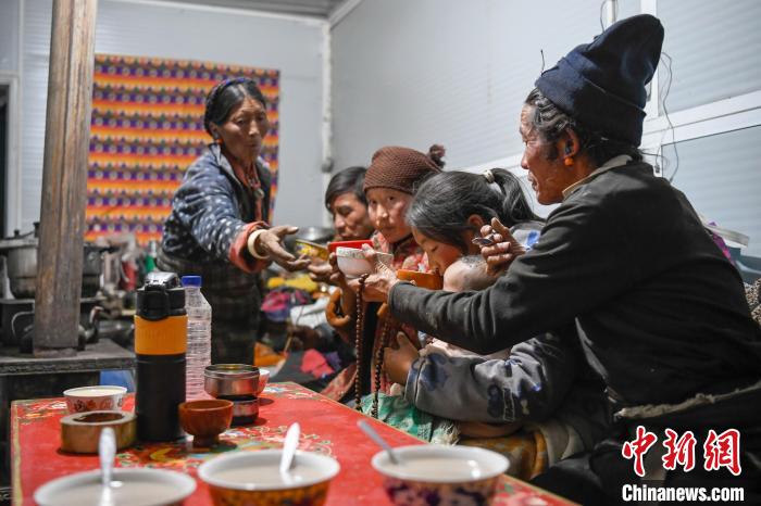 “今年我們家的‘古突’(一種藏式面食)里有面疙瘩、牛肉、蕨麻、奶渣、米飯,很香、很好吃?!?月28日是農(nóng)歷春節(jié)除夕,恰逢日喀則農(nóng)事新年“古突夜”,在西藏定日縣曲洛鄉(xiāng)措昂村安置板房內(nèi),20歲的央宗喝完一碗母親煮的“古突”后對中新社記者說。