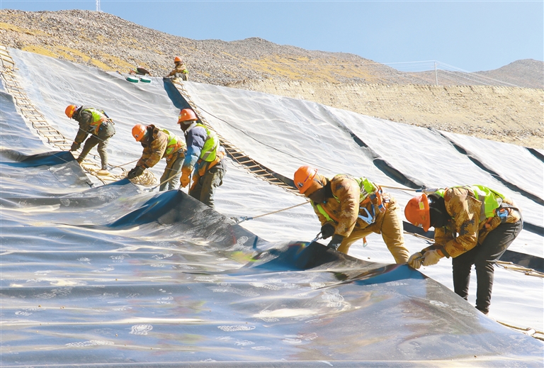 中鐵十七局集團第二工程有限公司西藏巨龍德慶普項目現場工人正在拉薩市達孜區(qū)海拔5000米以上的施工區(qū)域進行鋪膜防滲作業(yè)。