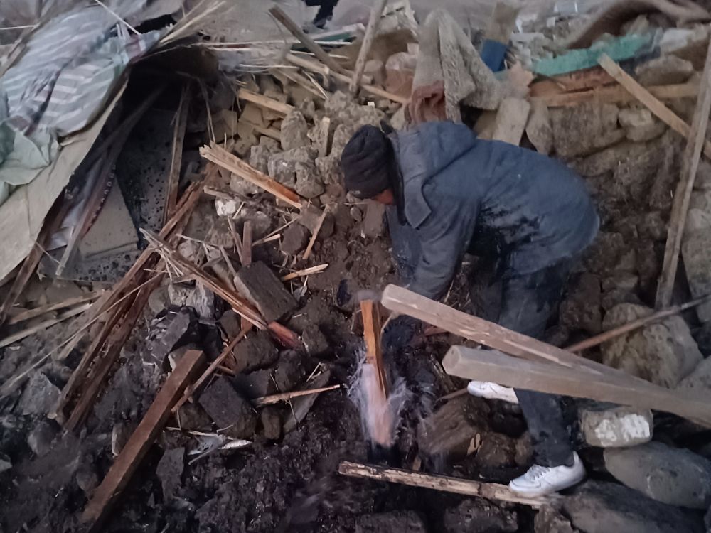 1月22日,在定日縣長(zhǎng)所鄉(xiāng)古榮村,旦增正在修爆掉的水管。(受訪者供圖)