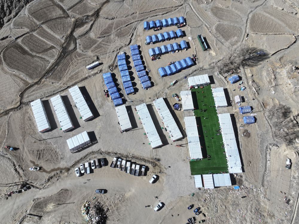 1月28日,定日縣長(zhǎng)所鄉(xiāng)古榮村安置點(diǎn),所有受災(zāi)群眾已搬入板房(無(wú)人機(jī)照片)。新華社記者 洛卓嘉措 攝