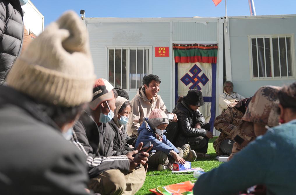 古榮村村委會主任桑杰(中)在安置點和群眾閑聊。新華社記者 晉美多吉 攝