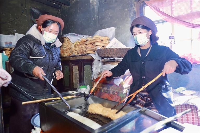 “德卡”,作為傳統(tǒng)藏式點(diǎn)心“卡塞”的一種,在藏歷新年的年貨清單里占據(jù)著不可或缺的位置。每到藏歷新年前夕,旦索朗一家便進(jìn)入了一年中最忙碌的時(shí)段——經(jīng)營起制作和售賣卡塞的生意。旦索朗回憶起小時(shí)候的新年,感慨萬分:“小時(shí)候過年,家家戶戶都自己炸卡塞,那時(shí)候,整個(gè)村子都被卡塞的濃香包圍著。現(xiàn)在生活條件好了,很多人覺得在外購買德卡更方便省事,這也給我們帶來了商機(jī)。我們做炸德卡的生意已經(jīng)6年了,一直都很受歡迎,還帶動(dòng)了6名村民一起參與,增加了大家的收入?!?/p>