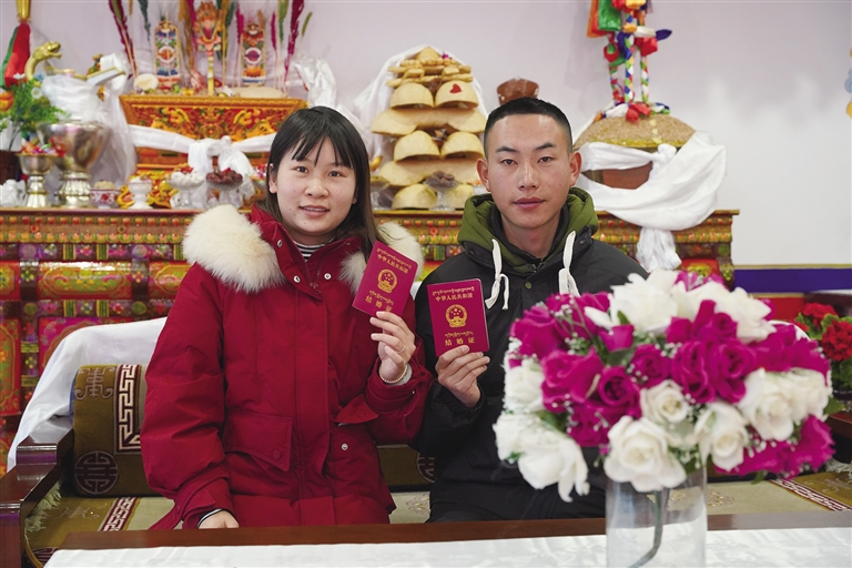 “我們在一起3年了,是表姐牽的紅線?!钡┰龈峦吣樕涎笠缰腋5男θ?,緩緩說道,“初次見到卓嘎,我就對她心生好感。相處一段時(shí)間后,我發(fā)現(xiàn)她性格溫柔,和我特別合拍,于是鼓起勇氣向她表白?!彼_心地展示著剛剛領(lǐng)到的結(jié)婚證,“情人節(jié)是個(gè)好日子,我們早就計(jì)劃好今天領(lǐng)證,現(xiàn)在終于如愿以償。以后情人節(jié)和結(jié)婚紀(jì)念日合二為一,既能少買一份禮物,也不用擔(dān)心忘記啦?!?/p>