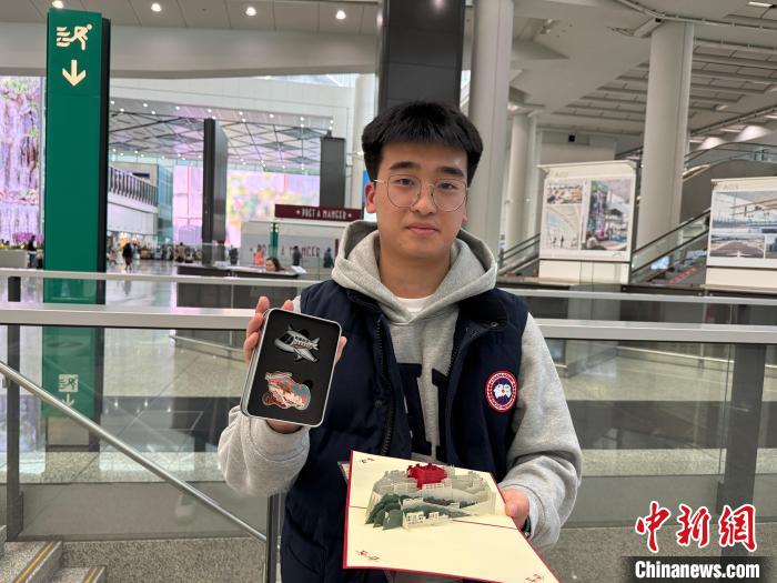 2月19日,西藏航空“拉薩-成都天府-香港”航線開通。圖為首航乘客曾帥向記者展示航空公司派發(fā)的首航紀念徽章和立體賀卡。中新社記者 韓星童 攝
