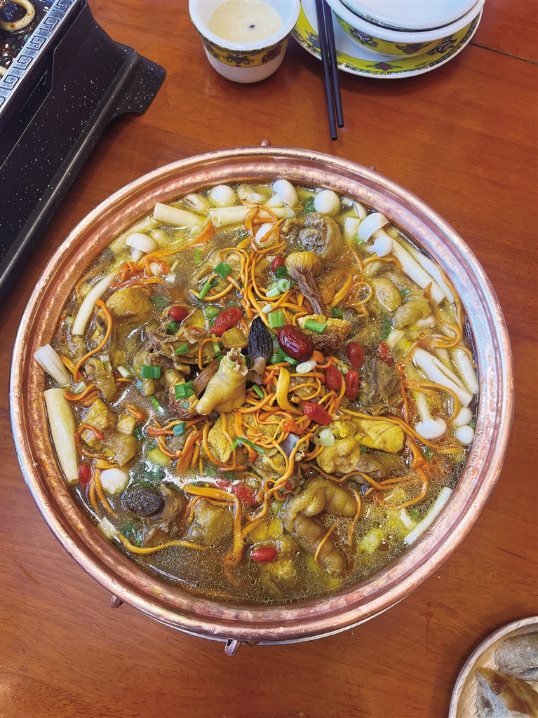 傳統(tǒng)的藏式牦牛肉火鍋講究原汁原味,湯底通常選用牦牛骨熬制數(shù)小時,加入少許鹽和香料即可。鍋底先鋪上一層時蔬和粉絲,再鋪一層牦牛肉排,最上面是土豆、蘿卜、白菜、青筍、木耳等耐煮的蔬菜,再加上肥瘦相間的新鮮牦牛肉慢慢燉煮。各類食材的香味相互碰撞,別提多香了!為了不掩蓋食物本身的香氣,藏式牦牛肉火鍋的蘸料通常比較簡單,可以用辣椒醬、蔥花、香菜等調(diào)制,也可以根據(jù)個人喜好加入芝麻醬、腐乳等。牦牛肉火鍋味道濃郁,建議搭配清淡的酥油茶或甜茶等飲品。