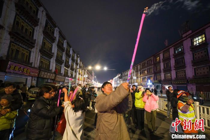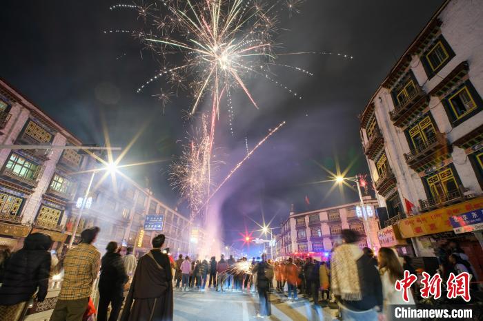 藏歷新年是西藏傳統(tǒng)民俗活動(dòng),也是中國(guó)國(guó)家級(jí)非物質(zhì)文化遺產(chǎn)。2月27日,西藏迎來(lái)一年一度的藏歷新年古突夜(類(lèi)似春節(jié)的除夕),如今過(guò)古突夜,西藏民眾在點(diǎn)燃火把的同時(shí),也會(huì)燃放煙花,古城拉薩煙花璀璨。圖為2月27日晚,拉薩當(dāng)?shù)孛癖娕c游客等在街頭共同慶祝藏歷木蛇新年的到來(lái)。中新社記者 江飛波 攝