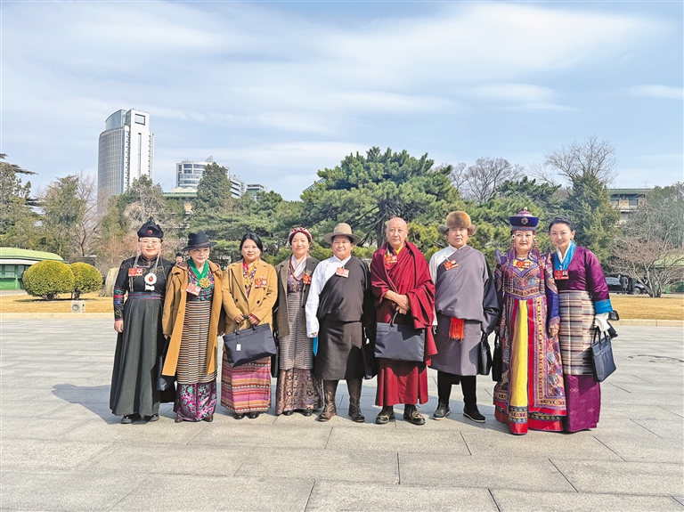 圖為住藏全國(guó)政協(xié)委員身著盛裝、滿懷豪情,在人民大會(huì)堂前合影留念。記者 丹增平措 攝