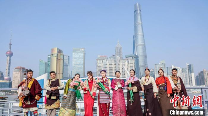 圖為西藏波密縣文旅推介人員身著民族服飾在上海合影。波密縣 供圖