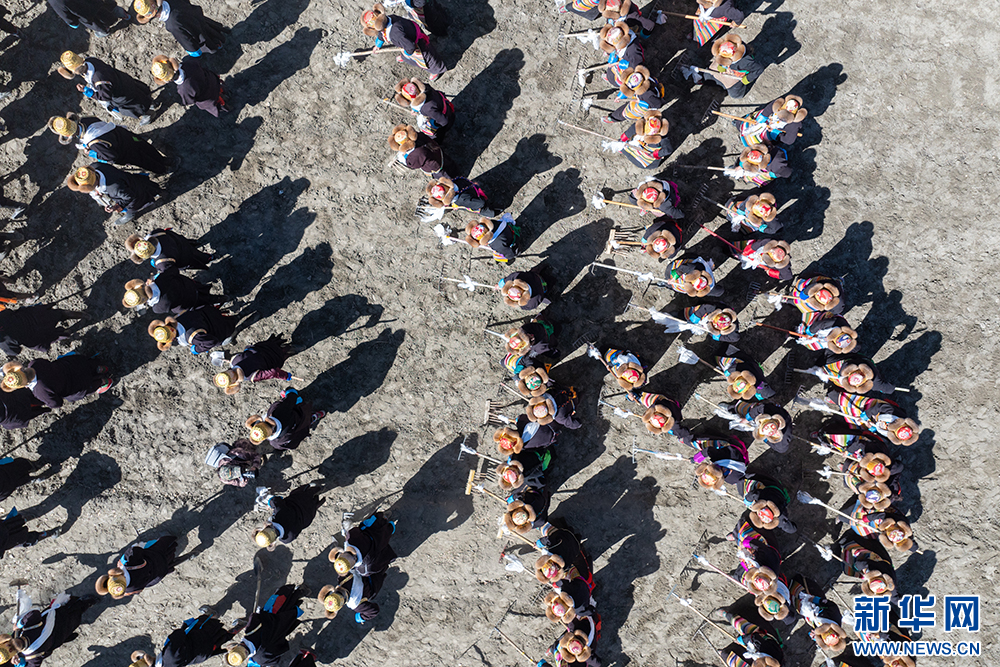 圖為西藏山南市乃東區(qū)門中崗社區(qū)春耕儀式現(xiàn)場(3月16日攝,無人機照片)。新華網(wǎng) 旦增努布 攝