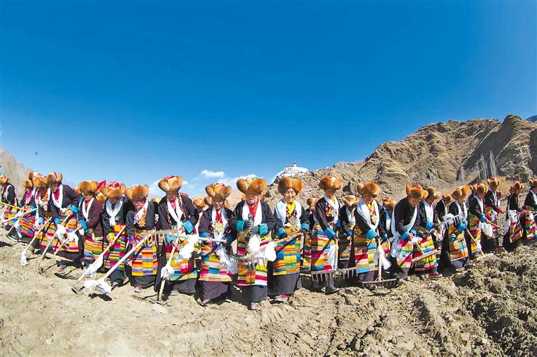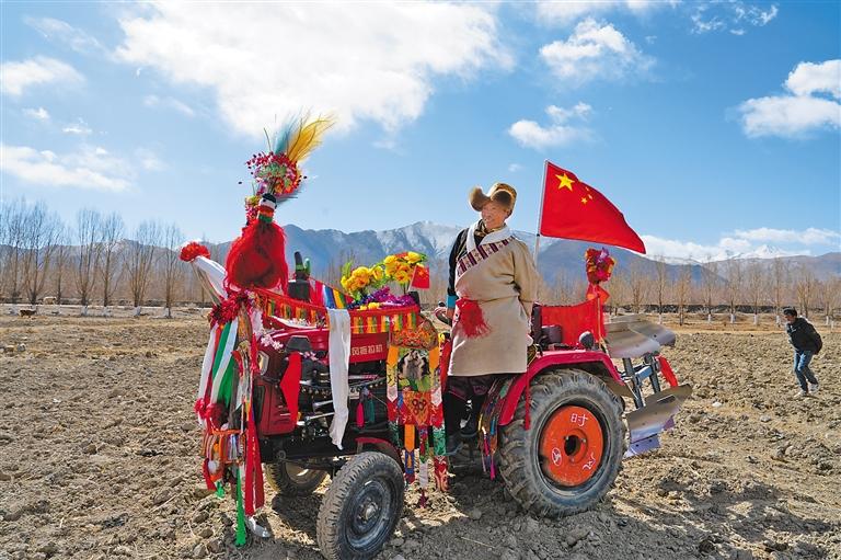 清晨,陽光灑滿田野,村民身著節(jié)日盛裝,手捧“切瑪”(五谷豐登斗),唱起祈愿歌,互敬青稞酒,臉上洋溢著喜悅與期盼。隨著長者的祈福聲響起,鐵犁緩緩翻開沉睡的土地,婦女們將手中的種子輕輕撒下,仿佛將希望播撒在這片沃土中。緊接著,拖拉機(jī)手們駕駛著現(xiàn)代化的農(nóng)機(jī)駛?cè)胩镩g,銀色的犁頭在陽光下閃耀,與傳統(tǒng)的木犁并肩作業(yè),轟鳴聲與歡笑聲交織在一起,奏響春耕的序曲。