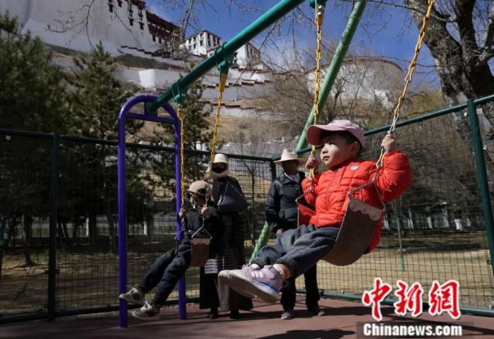 2025年3月13日,小朋友在西藏拉薩宗角祿康公園蕩秋千。坐落于布達(dá)拉宮腳下的宗角祿康公園是拉薩民眾戶外活動(dòng)的一大場(chǎng)所。中新社記者 李林 攝