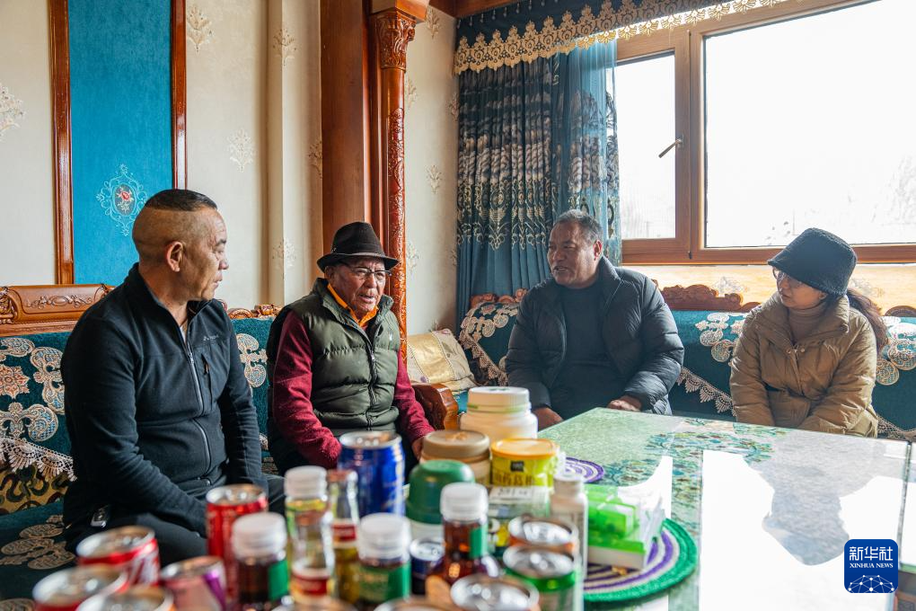 洛桑老人(左二)在家中和兒子及街坊聊天(3月20日攝)。新華社記者 丁增尼達(dá) 攝