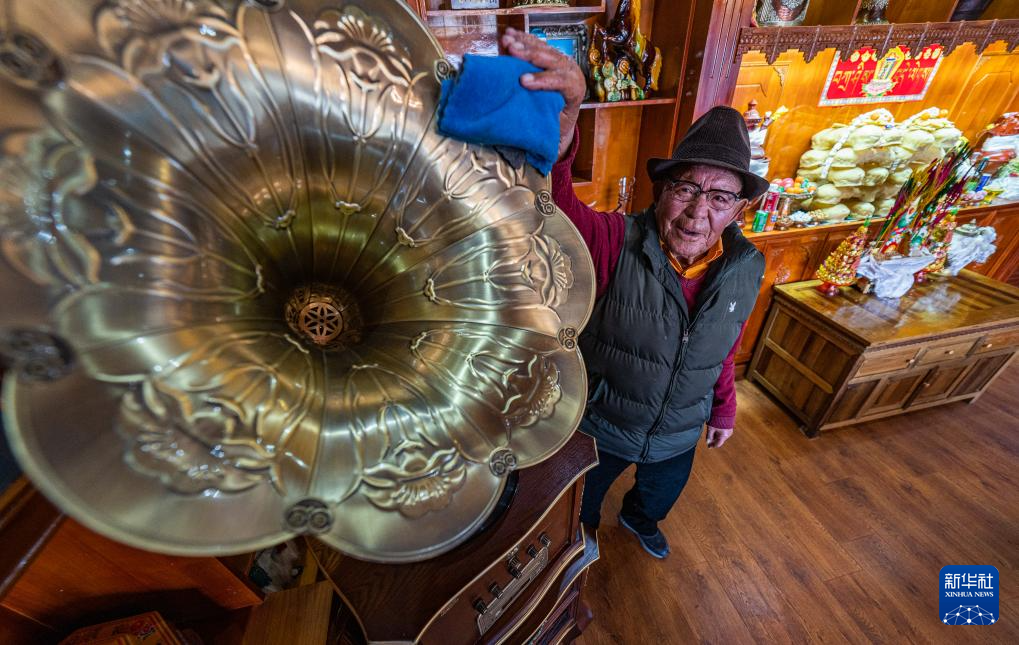 洛桑老人在家中擦拭留聲機(jī)(3月20日攝)。 新華社記者 丁增尼達(dá) 攝