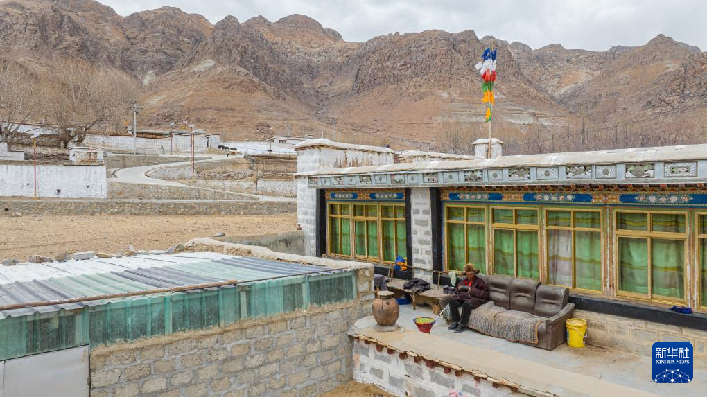 索扎老人在自家院子里聽收音機(jī)(3月20日攝,無人機(jī)照片)。新華社記者 丁增尼達(dá) 攝