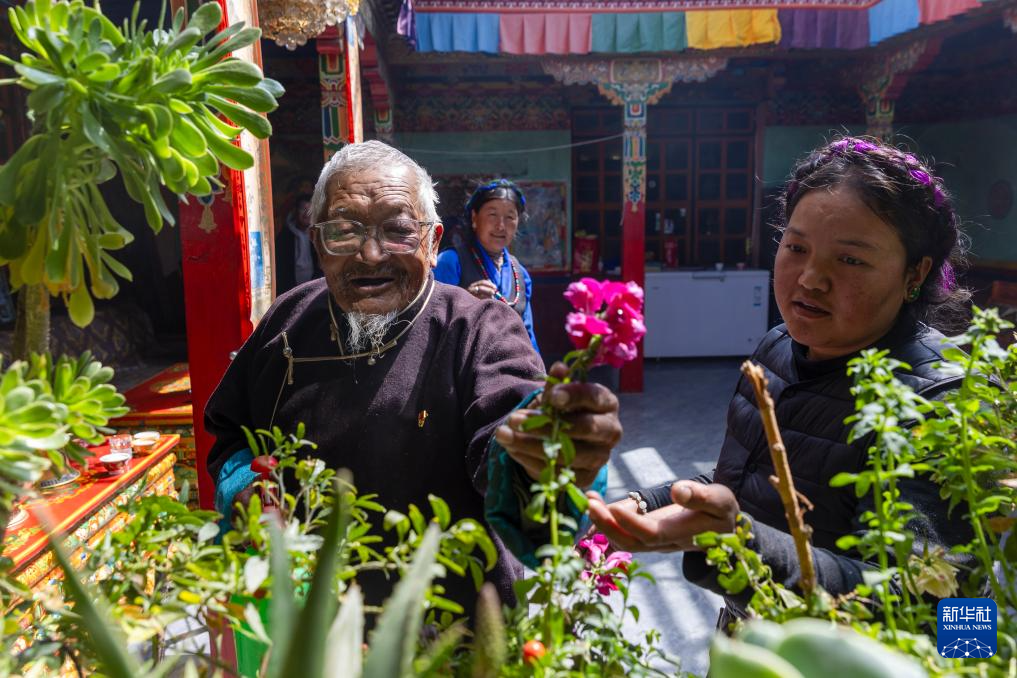 普瓊老人(左)在孫女的陪伴下侍弄家中的花(3月17日攝)。新華社記者 姜帆 攝