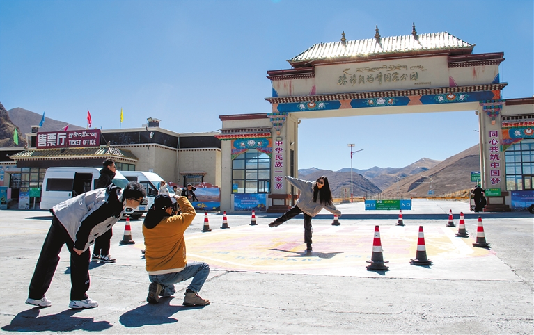 圖為游客在219國(guó)道5000公里打卡點(diǎn)拍照打卡。記者 旦增嘎瓦 扎西頓珠 攝
