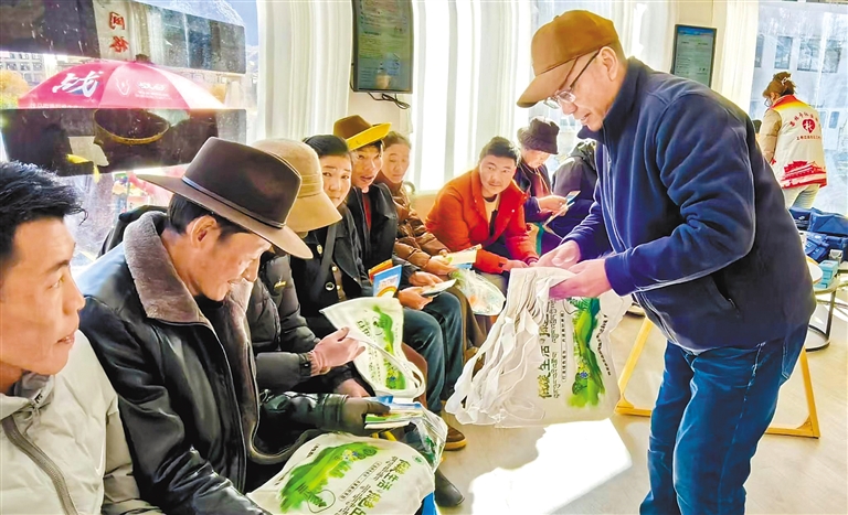 圖為工布江達縣社區(qū)工作人員向群眾發(fā)放宣傳品。