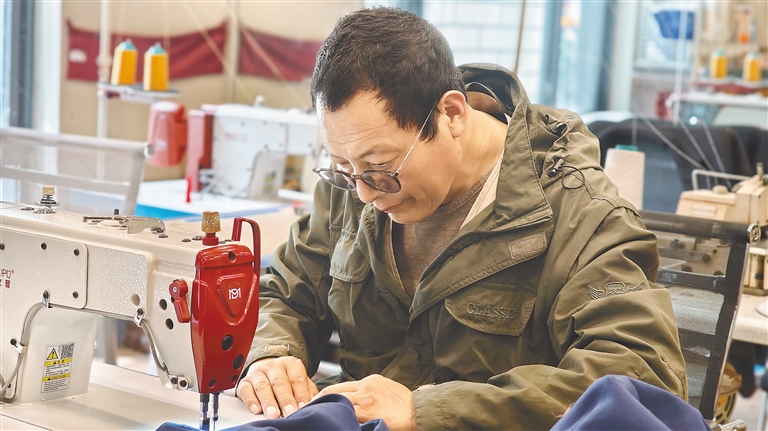 圖為自治區(qū)級(jí)非遺傳承人、雪堆白技工學(xué)校噠啦服飾工作室老師洛桑麥朗在制作藏裝。