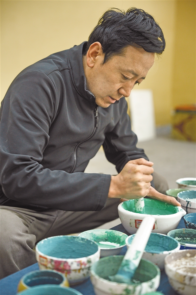 圖為唐卡(齊吾崗派)自治區(qū)級(jí)非遺傳承人、雪堆白唐卡畫(huà)院副院長(zhǎng)巴桑次仁在調(diào)配唐卡顏料。