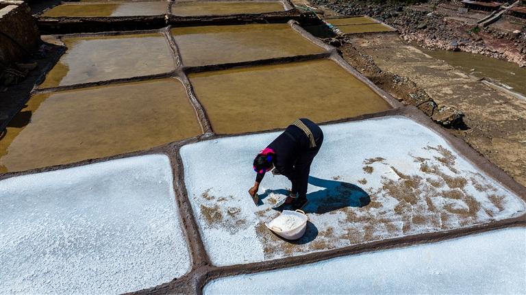 走進(jìn)加達(dá)村,便見村口的小攤位,那是加達(dá)村村民曲珍的鹽攤。曲珍從6歲開始便跟著母親下鹽井,“以前每天凌晨三四點起床,一直要干到晚上十點多才結(jié)束,現(xiàn)在有抽水泵就方便了很多?!庇捎诩彝ピ颍錄]有上過學(xué),一直跟著母親制鹽,所以對制鹽工序如數(shù)家珍。曲珍告訴記者,井鹽生產(chǎn)流程大致包括取鹵、濃縮、注鹵、曬鹽、晾鹽、收鹽、運(yùn)銷、修整鹽田等。傳承千年的制鹽技術(shù),就是從鹽井汲取鹵水倒入貯鹵池存放5—6天,將貯鹵池中的鹵水灌注到鹽田中,依靠風(fēng)吹日曬析出鹽粒。而后,將結(jié)晶的鹽刮成弧形以充分脫水。每年的11月至次年6月為曬鹽季,其中3-5月為旺季。