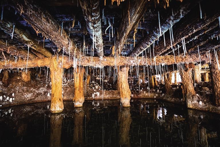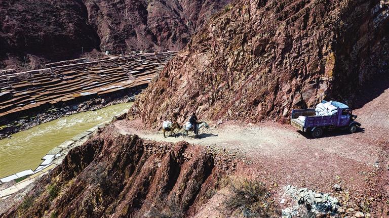 鹽田上,60歲的乃柯正和丈夫一起用木拍夯實鹽田?!艾F(xiàn)在用泵抽水輕松多了,但拍鹽田的手藝不能丟?!崩先说脑捳Z中,既有對科技的接納,也有對傳統(tǒng)的堅守。鹽田下方,鹽晶垂落成簾,在山風(fēng)拂動下閃爍微光,仿佛在訴說著千年文明的厚重。