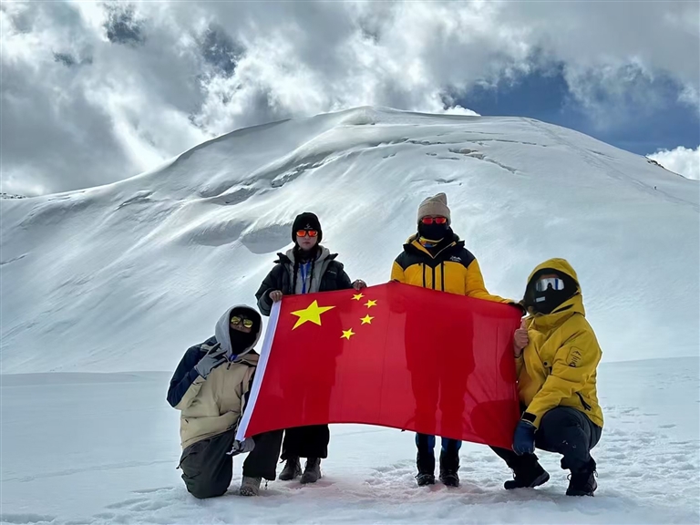鄒師思告訴記者:“登山過程中,我們團(tuán)隊(duì)展現(xiàn)了高度的專業(yè)性與協(xié)作力。學(xué)院領(lǐng)導(dǎo)提前提供物資與精神支持,專業(yè)教練指導(dǎo)徒步與技術(shù)訓(xùn)練。在海拔5500—6000米段,隊(duì)伍統(tǒng)一行軍節(jié)奏,避免體溫流失或體力透支;登頂時(shí),訓(xùn)練突出者率先觸頂,為體力較弱者提供鼓勵(lì)與幫助?!彼锌骸皥F(tuán)隊(duì)協(xié)作是登頂?shù)年P(guān)鍵,真正的勇氣源于科學(xué)準(zhǔn)備與戰(zhàn)略堅(jiān)持?!?/p>