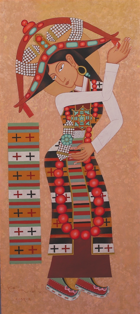 在昂?!皞鹘y(tǒng)當(dāng)隨時代”的藝術(shù)理念浸潤下,徒弟們總能在傳統(tǒng)與當(dāng)代的碰撞中找到獨特的表達(dá)坐標(biāo):來自日喀則的藝術(shù)家多吉次旺,早年被昂桑畫作中藏文元素與抽象色塊的融合所震撼。如今在拉薩創(chuàng)辦工作室的他,正將藏文書法的中鋒筆觸解構(gòu)為流動的視覺符號——烏金體的頓挫韻律幻化為色彩的潮涌,在畫布上重現(xiàn)古老史詩的“當(dāng)代心跳”;而主演《文成公主》實景劇的馮佳,這位四川傳媒大學(xué)表演系的畢業(yè)生,跟隨昂桑學(xué)畫四年,已能在《文成公主》系列中將唐卡礦物顏料的莊重與波普藝術(shù)的色塊切割并置,讓歷史人物既保有壁畫般的莊重感,又流淌著屬于時代的視覺節(jié)奏。