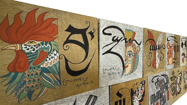 在昂桑的工作室中,《一日一畫》系列尤為醒目:藝術(shù)家采用布面重彩技法,讓唐卡礦物顏料與現(xiàn)代丙烯顏料滲透交融,傳統(tǒng)吉祥紋樣與幾何抽象圖案共生。韓書力評價:“他讓千年顏料與當(dāng)代審美共振,完成傳統(tǒng)藝術(shù)的‘基因重組’。”