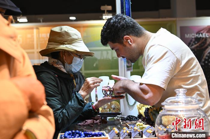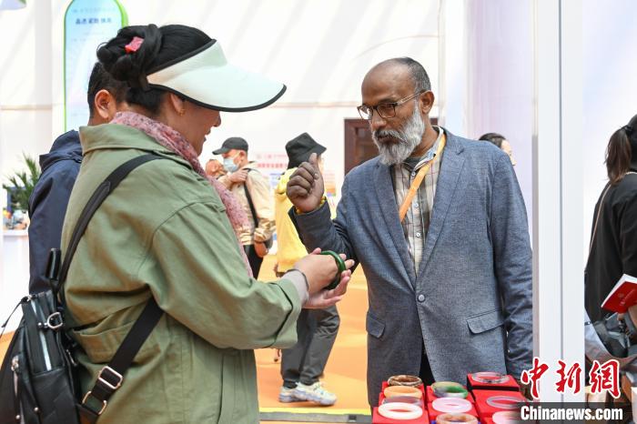 圖為拉薩進(jìn)口商品展覽會現(xiàn)場,巴基斯坦商人(右)向顧客介紹、推銷手鐲。中新社記者 貢嘎來松 攝