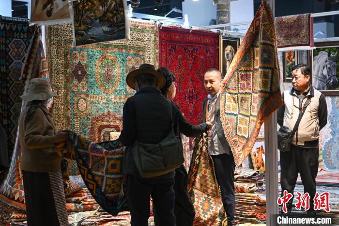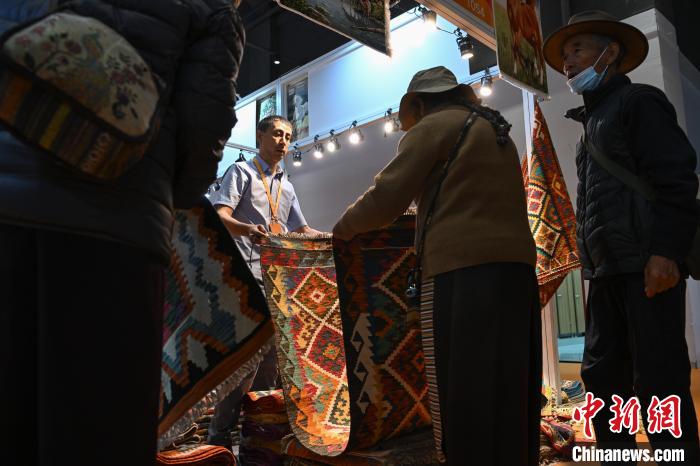 圖為拉薩進(jìn)口商品展覽會現(xiàn)場,伊朗商人(左)向顧客介紹、推銷毛毯。中新社記者 貢嘎來松 攝