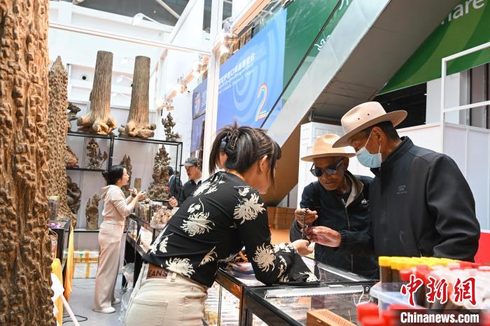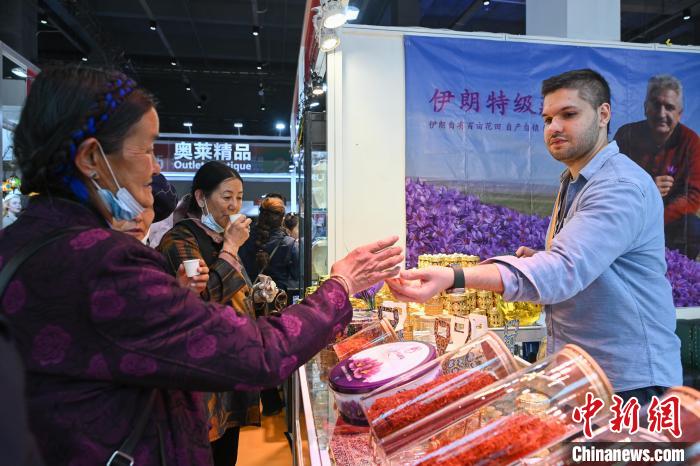 圖為拉薩進(jìn)口商品展覽會現(xiàn)場,伊朗商人(右)向顧客品嘗藏紅花。中新社記者 貢嘎來松 攝