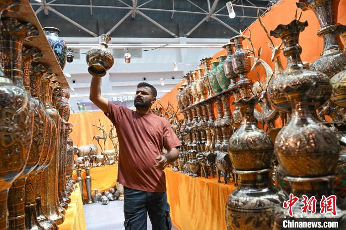 圖為拉薩進(jìn)口商品展覽會現(xiàn)場,巴基斯坦商人在展會上擺放商品。中新社記者 貢嘎來松 攝