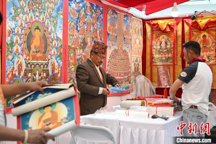 圖為拉薩進(jìn)口商品展覽會現(xiàn)場,尼泊爾商人在整理商品。中新社記者 貢嘎來松 攝