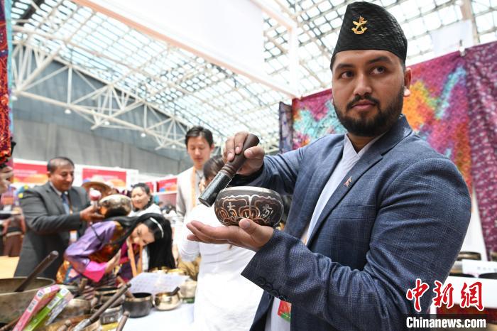 圖為拉薩進(jìn)口商品展覽會現(xiàn)場,尼泊爾商人介紹、推銷自己的商品。中新社記者 貢嘎來松 攝