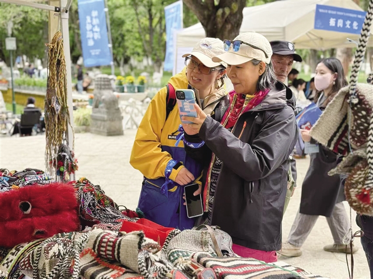 在西藏“非遺”文化體驗區(qū),來自湖南的游客張麗一邊挑選包包一邊感嘆:“哇噻,真的太神奇了!沒想到牦牛毛還可以做成這么漂亮的包包,我要多買幾個帶回去給朋友。還能把這份獨特的文化記憶帶回家。”
