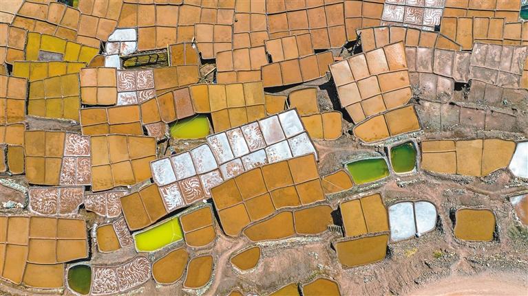 鹽田里,60歲的乃柯正和丈夫一起用木拍夯實(shí)鹽田?!艾F(xiàn)在用泵抽水輕松多了,但拍鹽田的手藝不能丟?!崩先说脑捳Z(yǔ)中,既有對(duì)科技的接納,也有對(duì)傳統(tǒng)的堅(jiān)守。鹽田下方,鹽晶垂落成簾,在山風(fēng)拂動(dòng)下閃爍微光,仿佛在訴說(shuō)著什么。一塊塊鹽田如同一面面鏡子,既映照出千年文明的厚重,也折射著鄉(xiāng)村振興的希望。當(dāng)鹽民們輕掃鹽田,他們掃的不僅是晶瑩的鹽,更是一份在傳承與創(chuàng)新中守護(hù)的鄉(xiāng)愁。