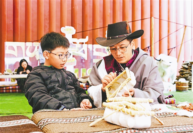 小朋友在西藏牦牛博物館向匠人學(xué)習制作牛皮船。