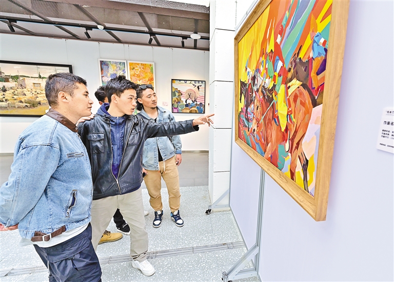 拉薩市首屆當代女畫家美術(shù)聯(lián)展在西藏非遺博物館開幕,市民群眾正在觀展。