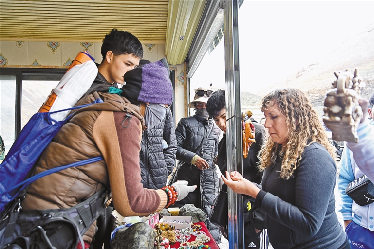 新奇感過(guò)后,游客們開(kāi)啟購(gòu)物模式?!鞍⒓?,這個(gè)掛飾可以定制嗎?”“你們可以發(fā)快遞嗎?”對(duì)于一連串的問(wèn)題,阿佳格桑忙碌地一一回答著,“你們想要什么圖形,我們就給你定制什么圖形。”“我們這兒快遞很快,今天下單明天就給你發(fā)!”短短半個(gè)小時(shí),“阿佳格桑工坊”的生意火爆,銷售藏式靠墊、藏式地毯、掛飾等特色產(chǎn)品4000多元?!盎厝ズ螅乙ㄟ^(guò)自媒體平臺(tái),宣傳這次西藏之旅的所見(jiàn)所聞,讓更多親朋好友來(lái)西藏旅游!”日本游客琴音有感而發(fā)。