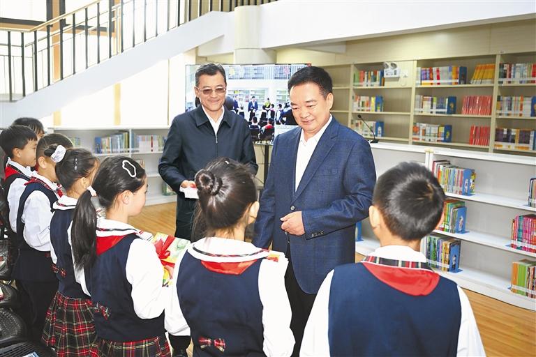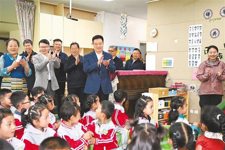 初夏,萬物并秀,生機(jī)勃發(fā),拉薩市實(shí)驗(yàn)小學(xué)書聲瑯瑯。王君正走進(jìn)校園,察看學(xué)校環(huán)境,參觀自然、閱讀、書法、體育等教育成果展示,了解學(xué)校歷史沿革、建設(shè)發(fā)展、教育教學(xué)等情況。他指出,習(xí)近平總書記高度重視、親切關(guān)懷少年兒童和少先隊(duì)工作,多次參加少先隊(duì)活動(dòng),發(fā)表重要講話、作出重要指示。5月27日,習(xí)近平總書記致信祝賀中國(guó)少年先鋒隊(duì)第九次全國(guó)代表大會(huì)召開,殷切寄語廣大少年兒童,飽含著對(duì)大家的深切關(guān)愛。要加強(qiáng)愛國(guó)主義教育,講好思政課,著力講好黨的故事、革命的故事、英雄的故事,時(shí)刻把祖國(guó)和人民放在心中,不忘初心、童心向黨,從小聽黨話、感黨恩、跟黨走;要積極推廣國(guó)家通用語言文字,把鑄牢中華民族共同體意識(shí)根植少年兒童心靈深處,引導(dǎo)他們爭(zhēng)做民族團(tuán)結(jié)的小石榴籽,爭(zhēng)當(dāng)學(xué)習(xí)和踐行社會(huì)主義核心價(jià)值觀的小模范。圖書館內(nèi),“紅領(lǐng)巾小書蟲”讀書分享活動(dòng)正在進(jìn)行,孩子們圍坐在一起,與定日縣長(zhǎng)所鄉(xiāng)完全小學(xué)學(xué)生視頻連線,共同分享喜歡的書籍,王君正認(rèn)真傾聽、親切詢問,向孩子們贈(zèng)送書籍。“祖國(guó)的未來和希望在你們身上,要熱愛祖國(guó)、好好學(xué)習(xí)、天天向上,從小培養(yǎng)良好的道德情操。”王君正鼓勵(lì)他們說,要多讀書、讀好書,從書中汲取智慧和營(yíng)養(yǎng),將來做對(duì)國(guó)家、對(duì)人民、對(duì)社會(huì)有用的人。