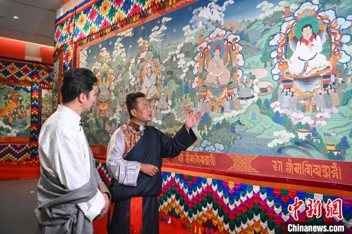 圖為民眾參觀唐卡《吐蕃贊普世系大唐卡金子明鏡》。貢嘎來松 攝