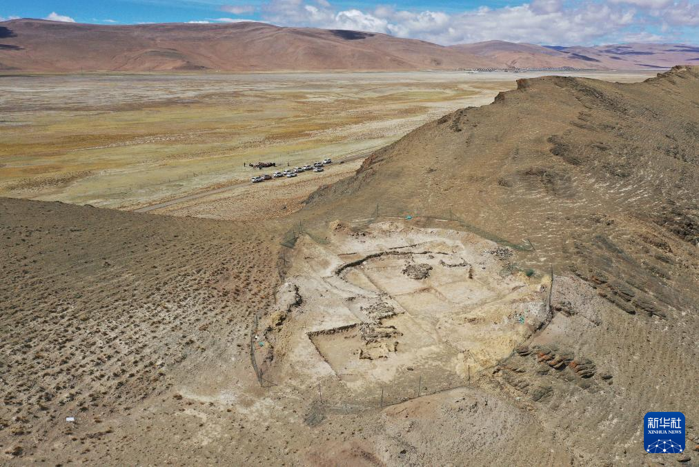 這是5月22日拍攝的坐落在瑪不錯湖畔的遺址第四期石構(gòu)地面建筑考古發(fā)掘現(xiàn)場(無人機照片)。新華社記者 李賀 攝