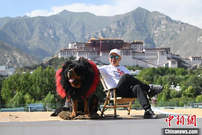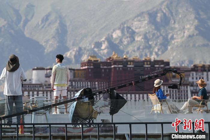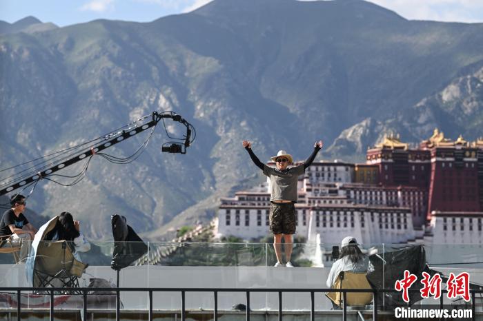 7月7日,游客在西藏拉薩市的一家景觀咖啡廳拍攝以布達(dá)拉宮為背景的 “旱地拔蔥” 。中新社記者 貢嘎來松 攝