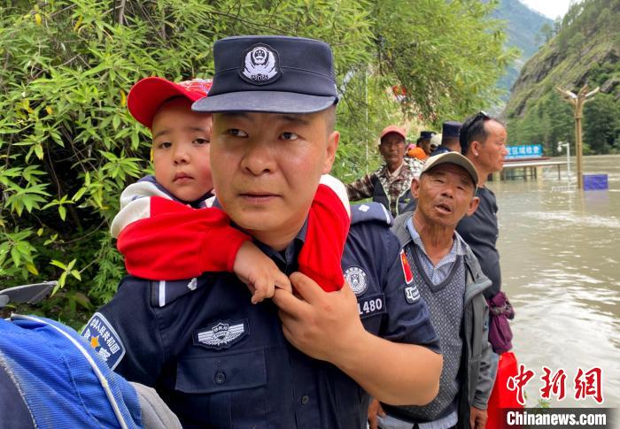 圖為7月8日,西藏吉隆出入境邊防檢查站民警轉(zhuǎn)移口岸區(qū)域受災(zāi)民眾。肖富貴 攝