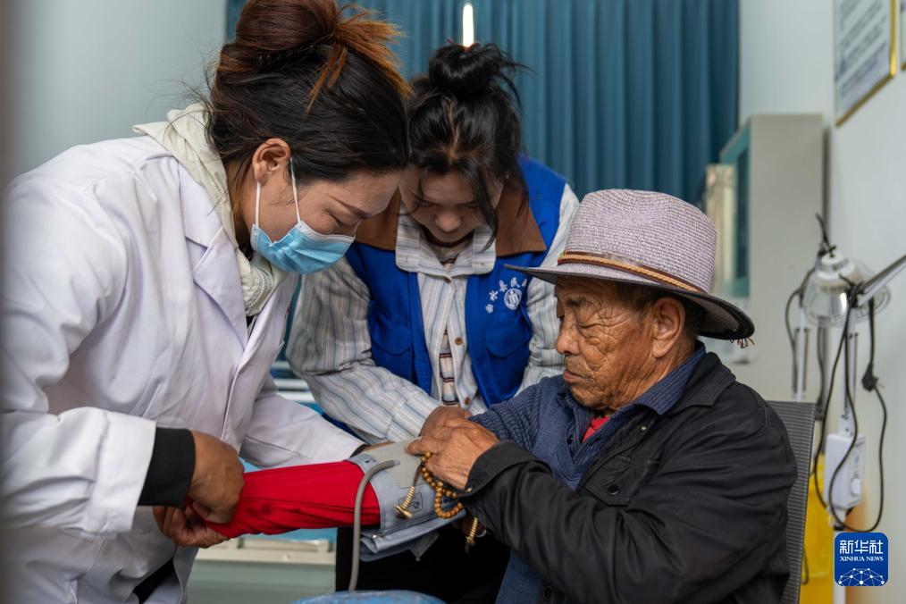 7月17日,村醫(yī)德慶拉姆在三有村幸福驛站日間照料室里為老人測(cè)量血壓。新華社記者 旦增尼瑪曲珠 攝