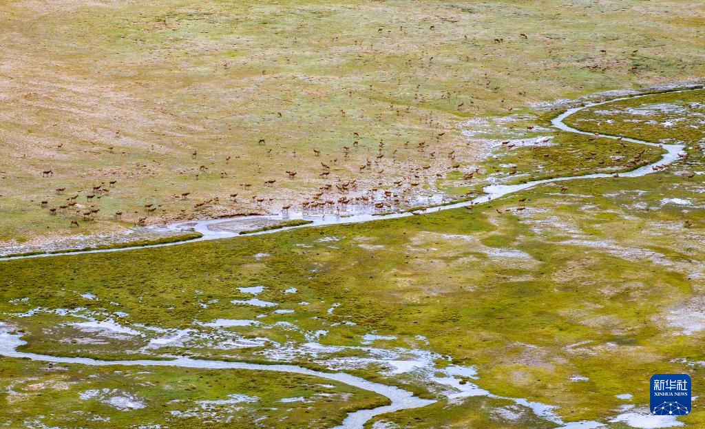 一群帶著幼崽的藏羚羊成功渡過森隆藏布河,幼崽身上水跡未干(7月15日攝)。新華社記者 姜帆 攝?