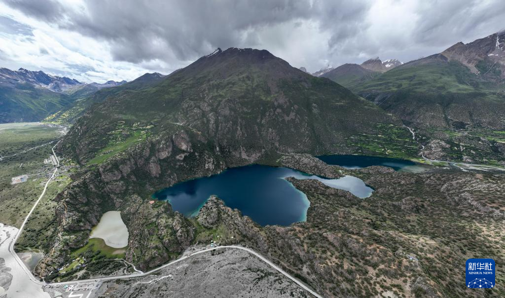 空中俯瞰“三色湖”,從左到右分別為黃湖、黑湖、和白湖(7月20日攝,無人機照片)。新華社記者 晉美多吉 攝