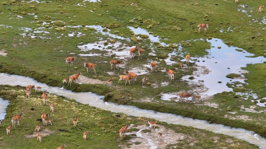 近日,藏羚羊群中,一只罕見的白色小藏羚羊緊隨母親,踏過河水順利抵達(dá)對岸,雪白的身影在群中格外醒目。